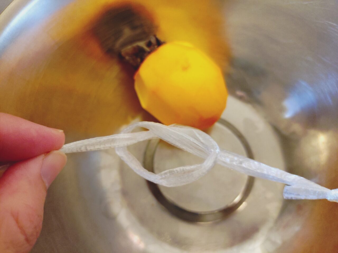 • お湯を沸かし、柿を10秒ほどくぐらせる。温度低下を防ぐため4個ずつくらいで。