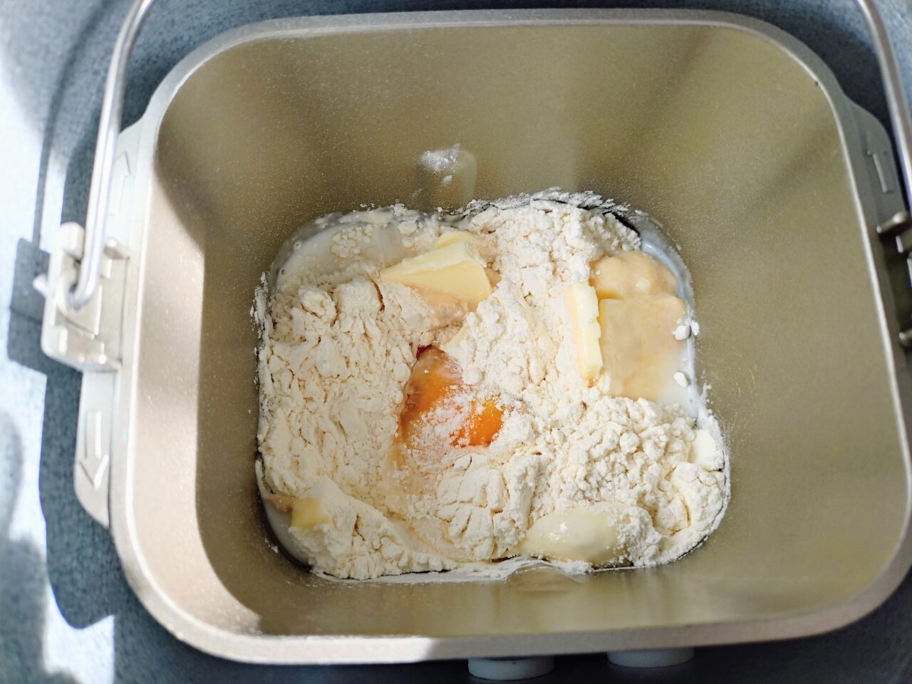 → ドライイースト、強力粉、バター、砂糖、塩、卵、牛乳