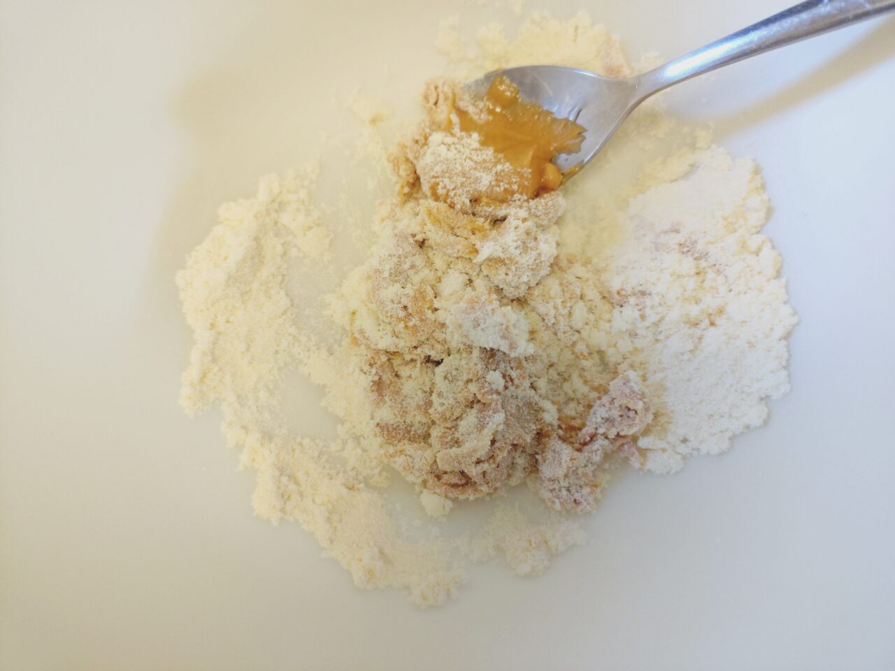 • ボウルにピーナッツクリーム、ホエイプロテイン、薄力粉、砂糖を入れてざっと混ぜる。
