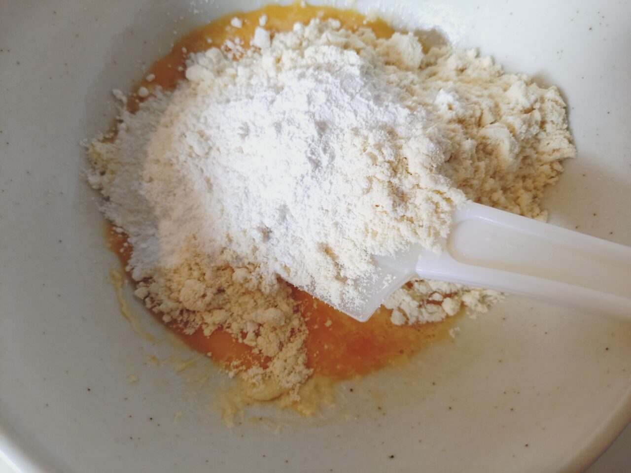 (砂糖・薄力粉・卵・ベーキングパウダーを入れた時点で、しっとり系になりますね)