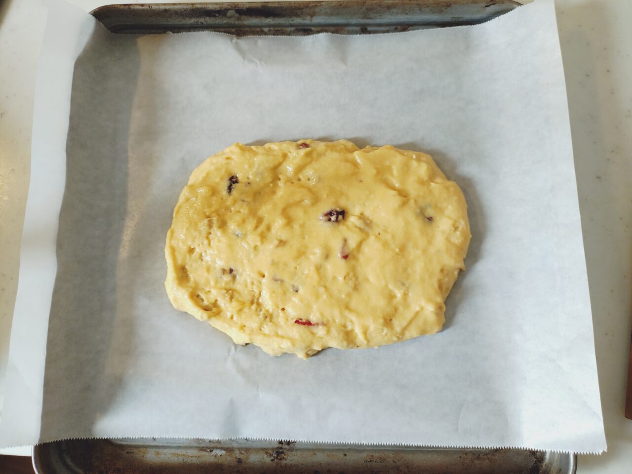 • クッキングシートの上に1cm程度の厚さに押し広げ、ヘラで適当な間隔に分ける。