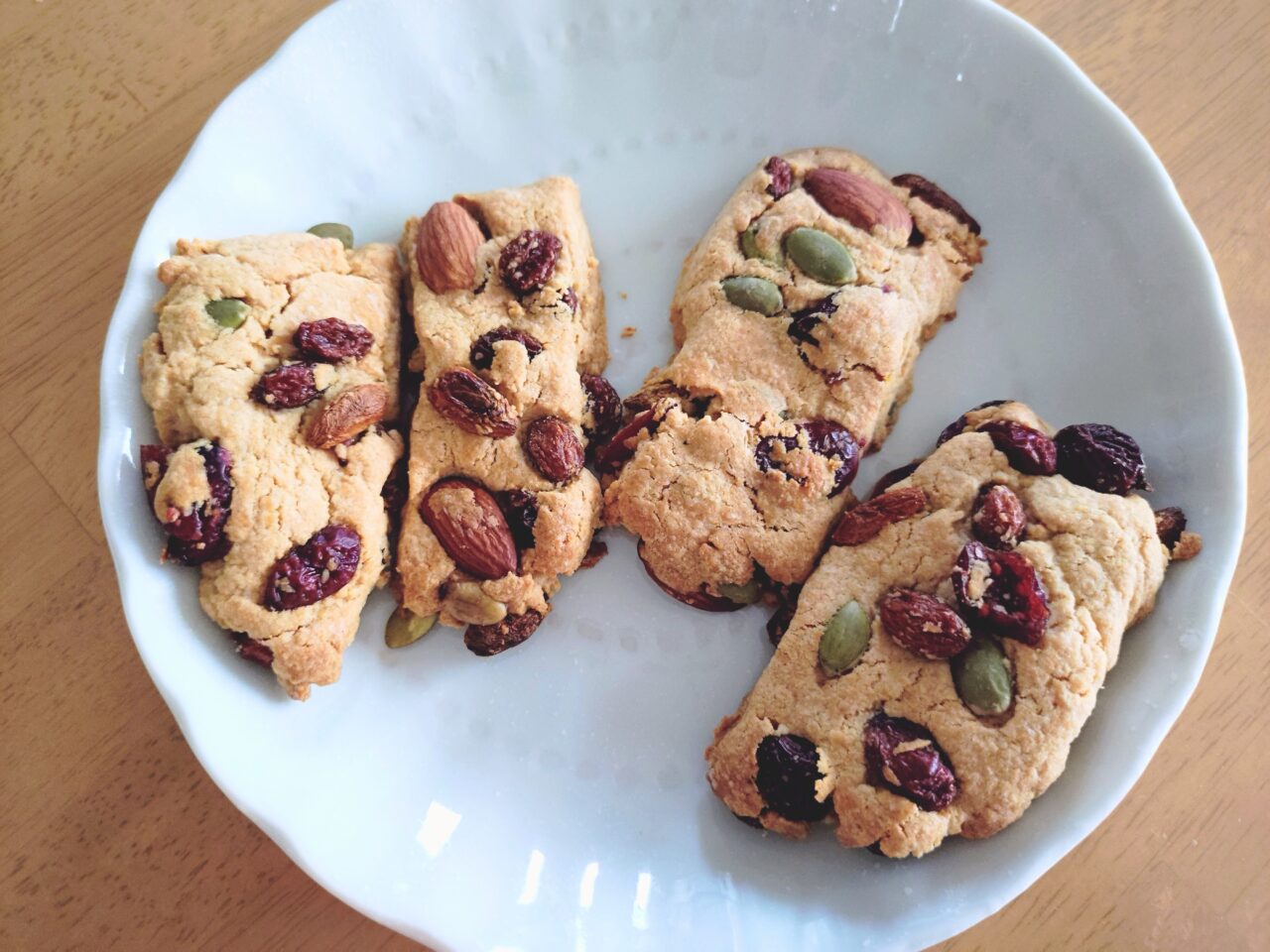 ホエイプロテイン(プレーン)を使った、さくさく食感で軽めの口当たりのおやつです。