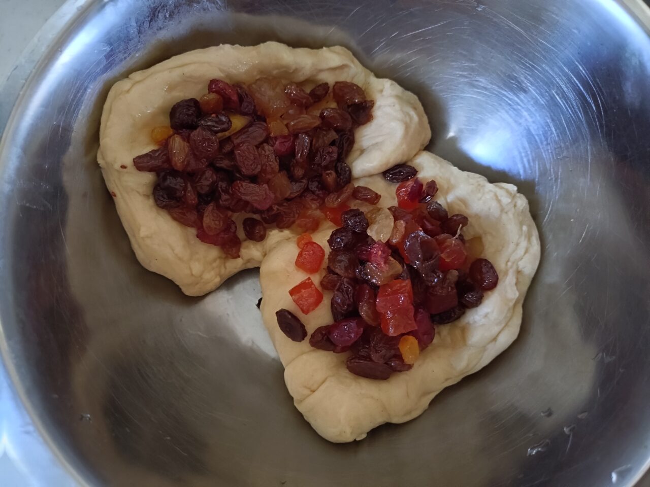 生地を広げ、ドライフルーツ(余分な水分は除去しておくこと)を包み込むよう、畳み込むようにして均一に混ぜる。