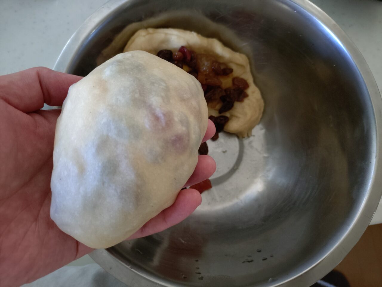 - 一次発酵後に手でドライフルーツを混ぜる。混ざりにくい!